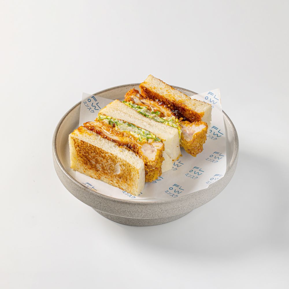 японский молочный хлеб, бедро цыпленка в панировке, обжаренное во фритюре, салат айсберг, майонез, кинза, зеленый лук, соус никири-унаги, соус азия, соус японский bbq, кунжут кимчи.