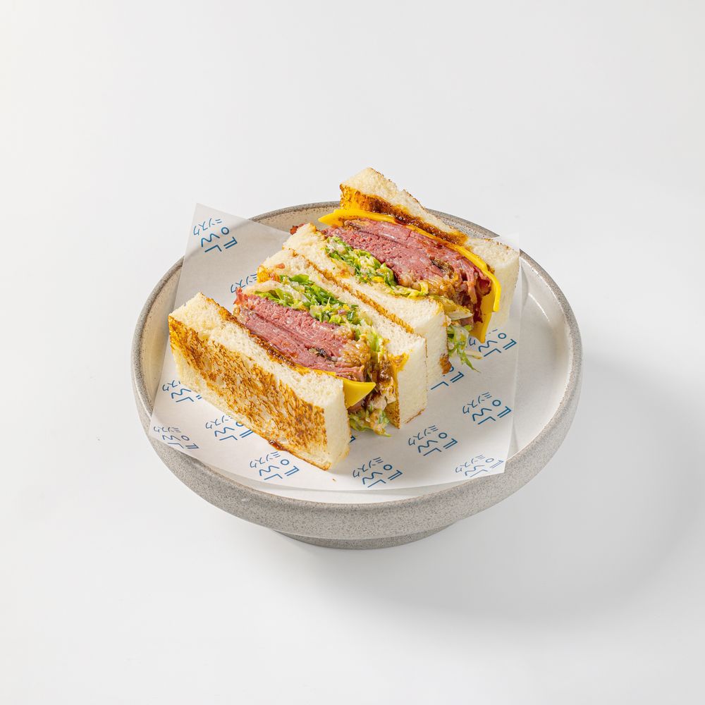 японский молочный хлеб. Пастрами - говядина, соль, сахар, перец, паприка, чеснок. Сыр чеддер, японский bbq, японский майо, капуста пекинская, капуста кимчи, кинза, зеленый лук.