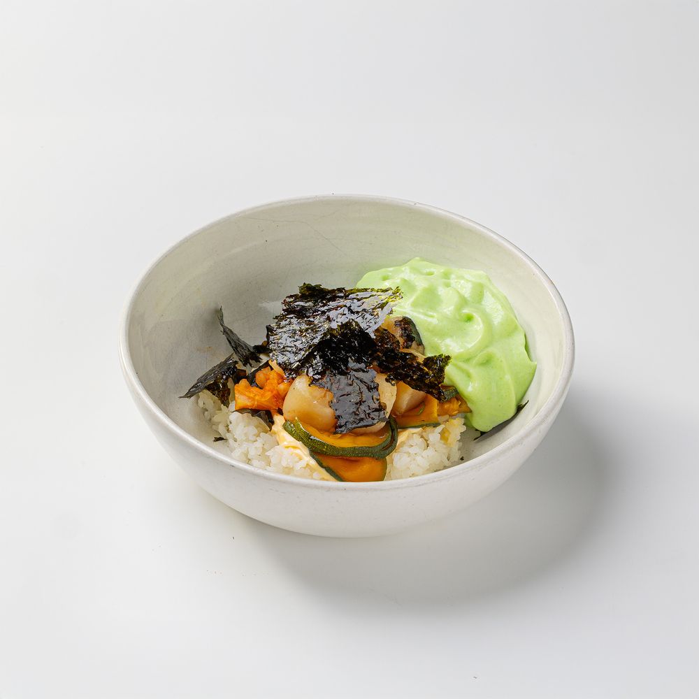 Рис для суши,японский майонез,вакаме маринованный,лимонный цукини,гребешок,капуста кимчи,соус понзу авокадо,мусс васаби,морская капуста