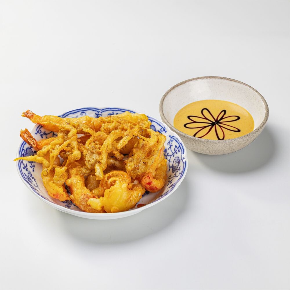 Микс морепродуктов и овощей в ароматной темпуре с пикантно-сливочным соусом васаби и сладостью терияки