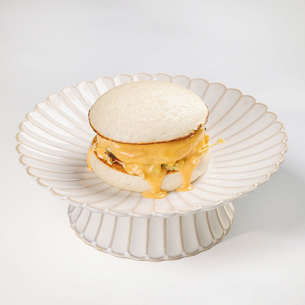 Паровая булочка бао с нежной куриной котлетой, свежим салатом айсберг и томатами, дополненые сладковатыми соусом чили