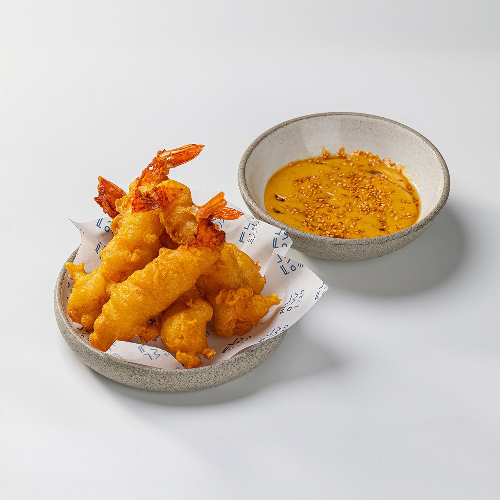 Креветка очищенная темпура, соус васаби, соус унаги, кунжут кимчи.